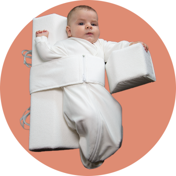 Während dein Baby schläft, sorgt die VARILAG® Seitenlagerungsschiene dafür, dass es sicher liegt und dabei Kopfverformungen sanft korrigiert werden.